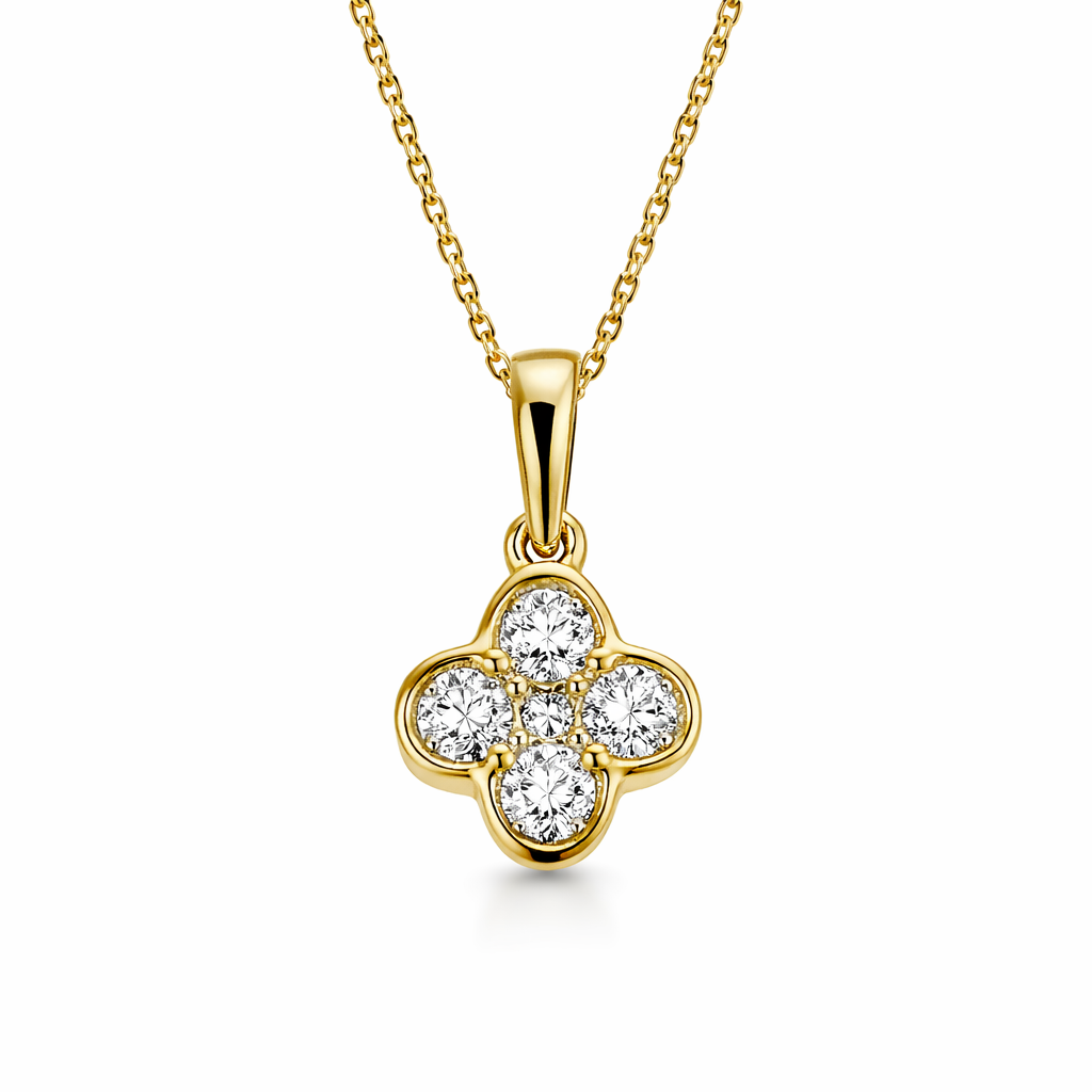 Pretty and delicate as a petal, this flower shaped diamond pendant in 9K Yellow Gold is studded with five dazzling round diamonds totalling 0.43ct.