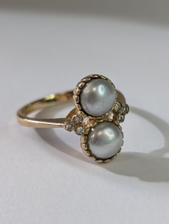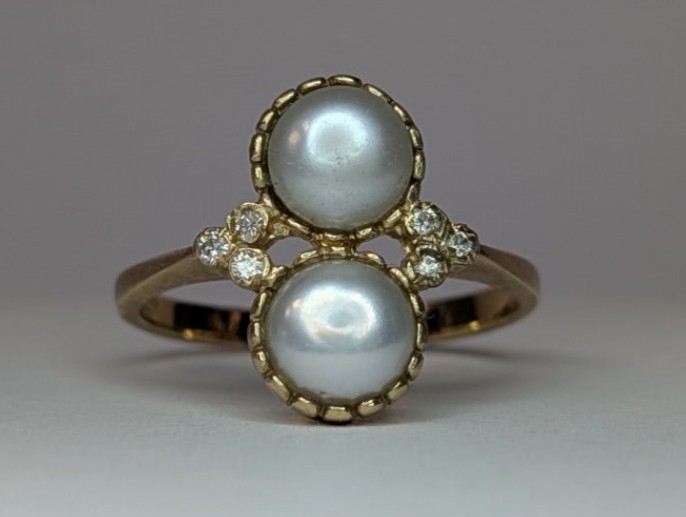 9ct yellow gold ring holding 2 cultured pearls in a fancy bezel setting highlighted with three diamonds each side