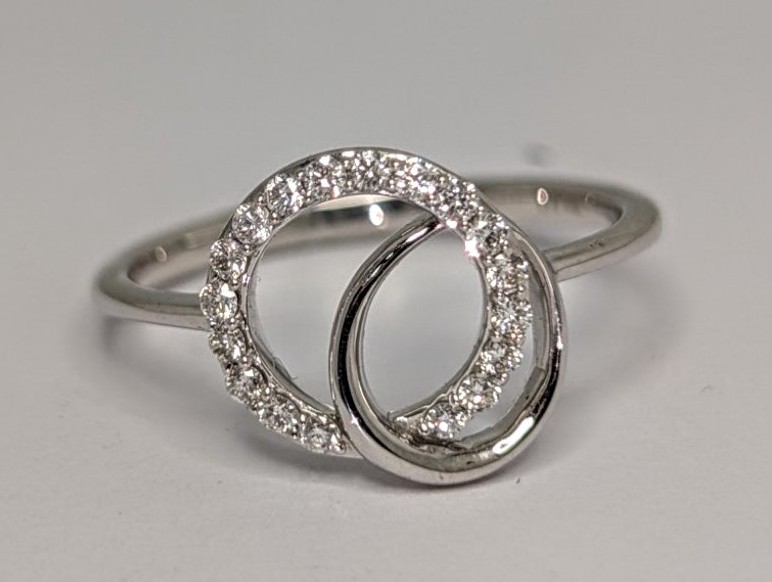 18ct white gold ring with larger circle of diamonds totalling 0.17ct interlocking a plain smaller circle